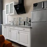The interior is set up for maximum convenience, featuring a stone fireplace and soundproof windows, along with a sofa. Guests can make the most of their downtime at this apartment with the availability of media facilities, such as a TV, ensuring a pleasant leisure experience. Beds fitted with hypoallergenic pillows are at guests' disposal. A bathroom includes a walk-in shower and a separate toilet, as well as a hair dryer and bath sheets.